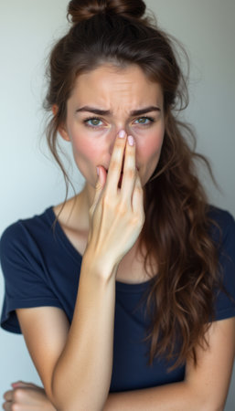 A young woman with long, wavy brown hair is grimacing, holding her nose in a gesture of disgust. Her expressive face captures a moment of strong emotion, highlighting her reaction to an unpleasant situation.