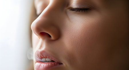 Close up profile of a woman breathing, highlighting the delicate pores and eyelashes, emphasizing natural beauty and potential cosmetic enhancements