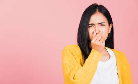 Asian beautiful young woman unhappy what a smell disgust expression squeezing nose with fingers. Female have something stinks bad smell situation, studio shot isolated on pink background, Healthcare