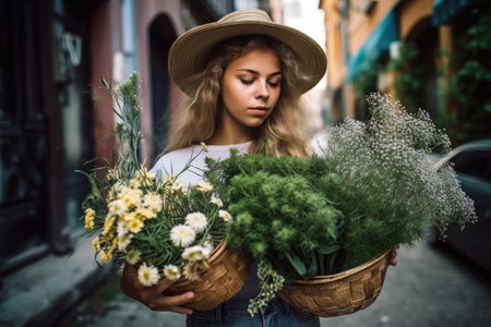 shot of a young woman carrying an assortment of plants, created with generative ai