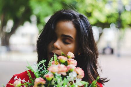 Outdoor portrait of young beautiful girl 19 to 25 years old. Brunette. sniffing a bouquet of flowers. Wearing red blouse City lifestyle. Female fashion concept.