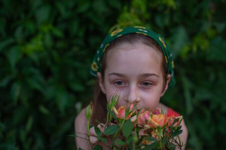 Little girl on the street against a background of green foliage. Girl with long hair. Child 9-10 years old girl in summer.Girl 8-9 years old in an orange sundress and a green scarf on her head.teenage
