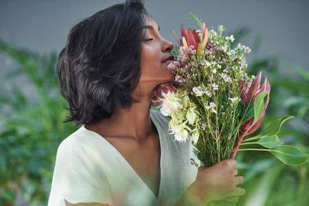 Smelling their fragrance has the power to stop time. a beautiful young woman smelling a bouquet of flowers.