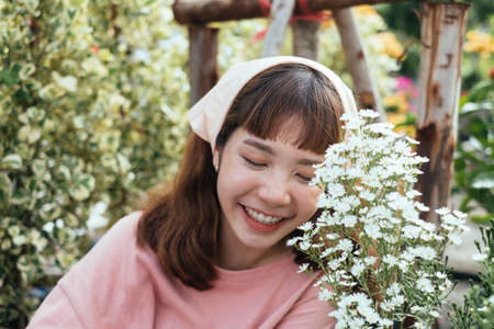 Woman enjoying the scent of flowers in a garden or flower market