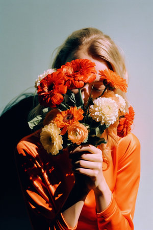 An AI-generated illustration of a female model hiding behind a vibrant flower bouquet.