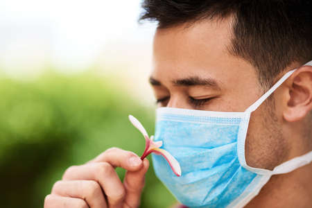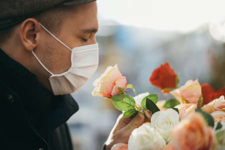 Spring in coronavirus COVID-19. Man in medical mask sniffs fresh flowers while quarantining. Limitation sensation smells, fresh air.