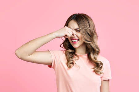 Portrait of unhappy woman wearing green T-shirt posing isolated over pink background, standing and holding bouquet of lilac flowers, touching nose, having allergy symptoms.