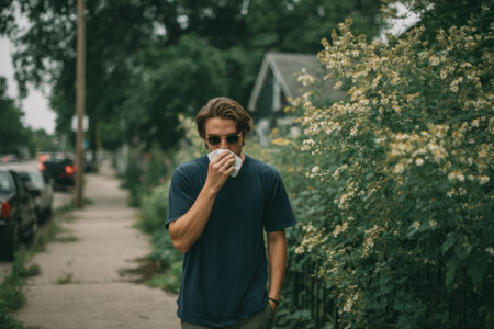 Young man sneezes because of an allergy to ragweed, generative ai illustration
