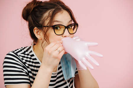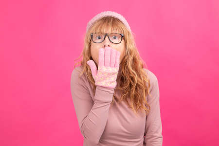 little girl in fashionable glasses and clothespins on her hair emotions pink background hearts