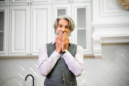 Stylish grandfather holding hands over his mouth being pleasantly surprised
