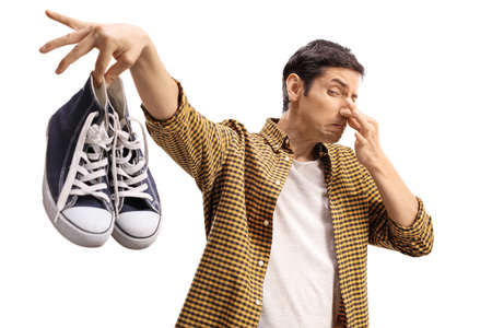 Close-up Of A Man Covering His Nose While Holding Stinky Shoe Against White Background