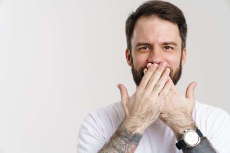 Bearded man with tattoo looking at camera while covering his mouth isolated over white background