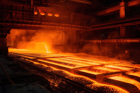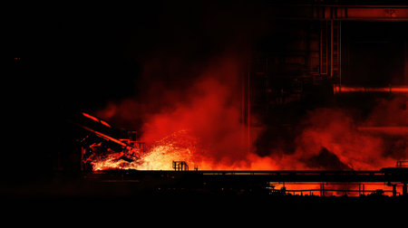 This dynamic image captures the intensity of steel production in an industrial forge, highlighting fiery molten metal and heavy machinery in action.