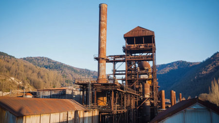 This image showcases a weathered industrial complex featuring a tall smokestack set against a backdrop of mountains and clear skies. The scene captures the essence of industrial heritage.