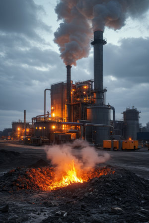 aluminum smelting plant, with towering flames and smoke filling the sky, created with generative ai