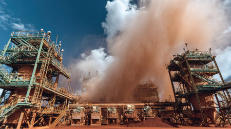 Medium shot of industrial machinery processing bauxite ore through the dry alumina refinement method with dust and particulate control systems in place.