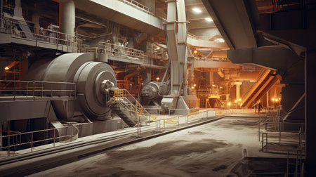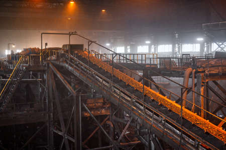 This image captures industrial machinery pouring raw material into a conveyor belt within a warehouse setting, showcasing the gritty environment and operational dynamics.