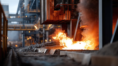 Molten metal flows from a blast furnace at a steel mill, creating a fiery display. The intense heat and industrial machinery add to the scene