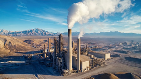 High above a bustling cement production plant, smoke billows from the chimney while the sun shines down, illuminating the rugged mountains and industrial landscape.