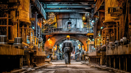 A dedicated worker walks through a vibrant industrial factory filled with heavy machinery, showcasing the dedication and progress in modern manufacturing settings.