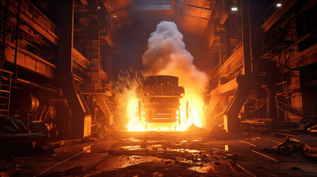 A captivating industrial scene showcasing fiery machinery amidst billowing smoke, highlighting the intense atmosphere of manufacturing and engineering processes.