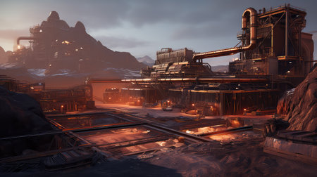 Dramatic industrial landscape showcasing machinery working amidst large piles of materials with misty mountains in the background during dusk.
