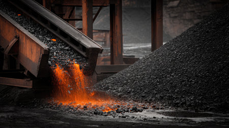 Conveyor belt system in motion, releasing dark coal onto storage pile at mining facility