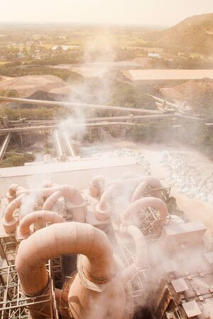 Top view of cement factory, dusty and steam was blowing in the factory, village and mountain in the dust in the evening, hot weather. Dust and grain.