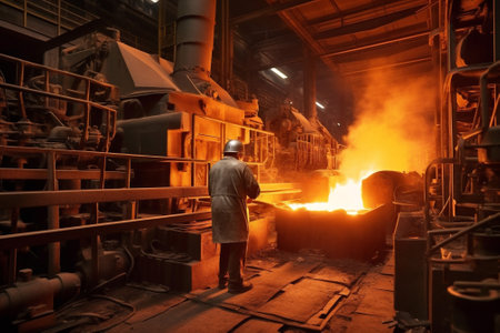 Worker in a steel mill overseeing molten metal pouring, surrounded by intense flames.