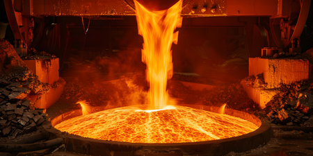 Liquid metal pouring from a blast furnace in a steel mill, creating a powerful image of industrial manufacturing