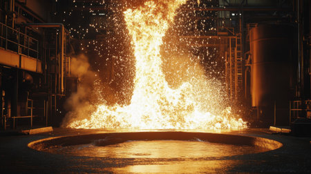 Captivating image showcasing the intense eruption of molten metal, surrounded by a dark industrial environment filled with sparks and flames.
