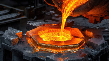Molten metal pouring from a crucible, capturing the intense heat and vibrant orange glow of the liquid fire. Generative AI