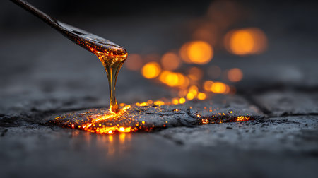 A fiery scene featuring molten metal glowing against a dark background, illustrating the captivating beauty and power of heat and transformation in industrial settings.