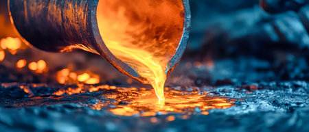 An artistic depiction of molten metal pouring from a crucible, showcasing a vibrant glow against dark textured rocks, capturing the essence of industrial craftsmanship.