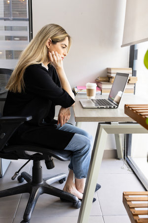 Shot of tired business woman with neck pain looking uncomfortable while working with laptop in the office.