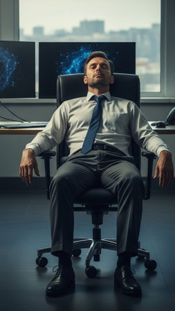 A young man sits back in a chair with his hands behind his head, gazing upwards. He is in a brightly lit office space.