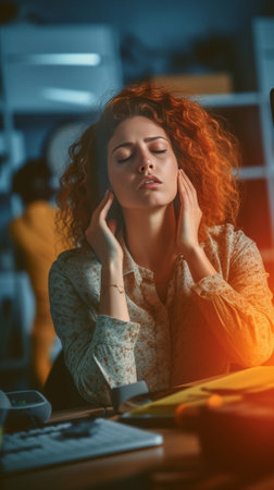 Feeling exhausted Frustrated young woman touching her head and keeping eyes closed while sitting at her working place in office : Generative AI