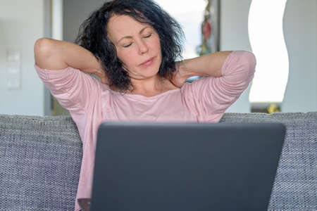 Woman is working on her computer and has neck pain