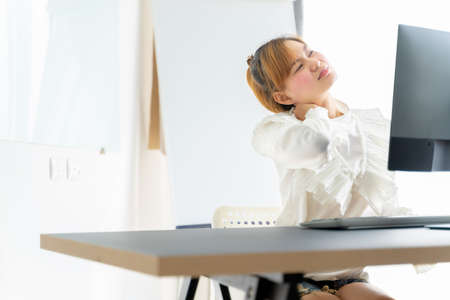 Young asian woman is sitting at work and has pain in her neck while she is sitting in the office working