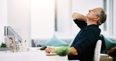 My neck is starting to give in now. Shot of a mature businessman suffering from neck pain while sitting at his desk at work.
