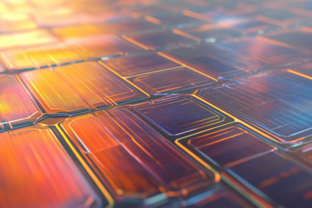 Close view of interconnected solar panel cells reflecting vibrant colors under soft light.
