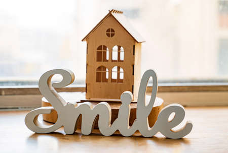 selective focus. the word House made of small square pieces of wood, copyspace. on a beige-coffee monochrome background