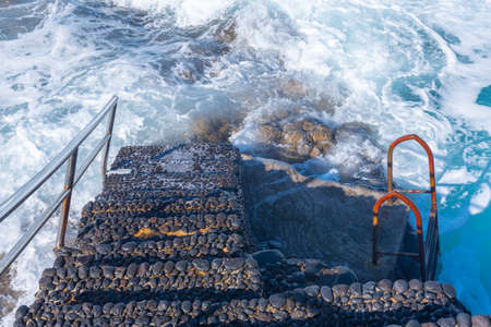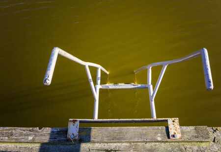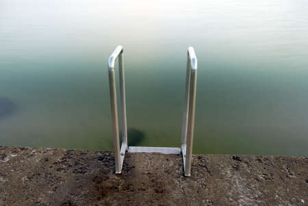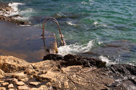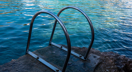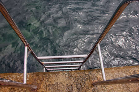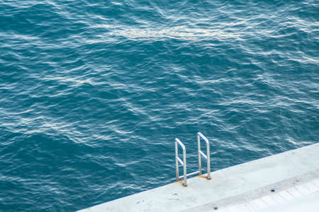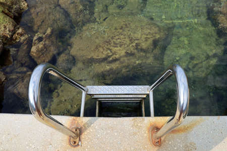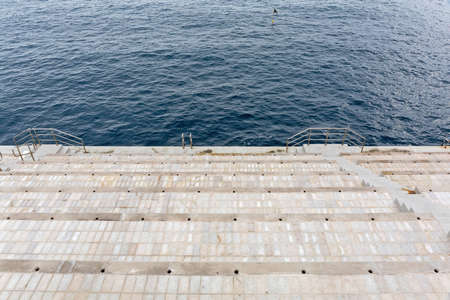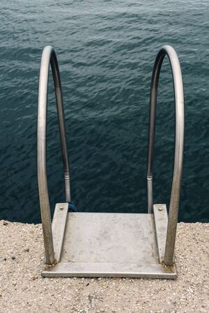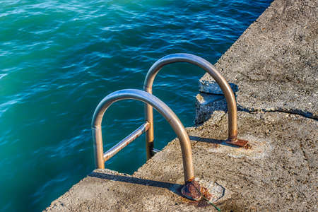 swimming ladder stainless steel for descent into water on concrete pier on Black sea in Crimea