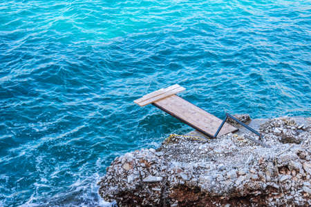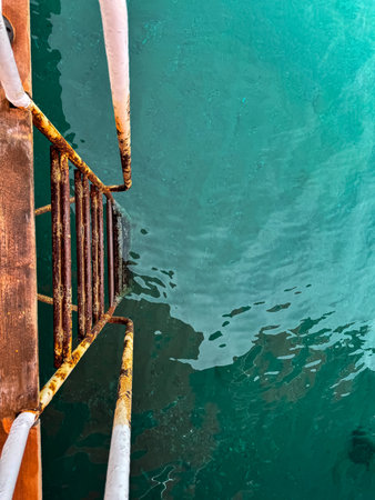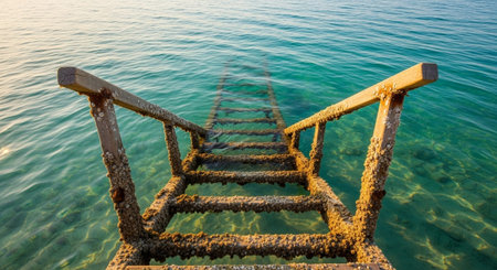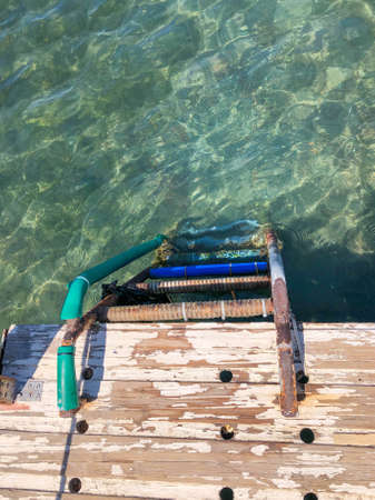 Old vintage metal wooden stairs leading to blue turquoise sea water from beach. Beautiful summer day. Swimming pool with grunge retro stairs on the ocean coast. Top View.