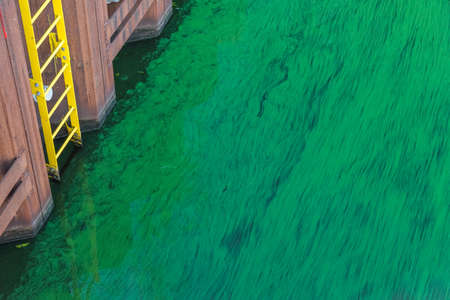 The yellow ladder at the rusty shore fortification