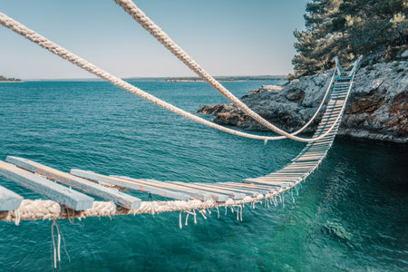 Rope bridge over a cliff in Punta Christo, Pula, Croatia - Europe. Travel photography, perfect for magazines and travel destination articles.