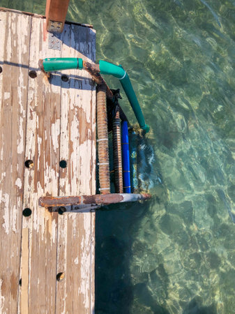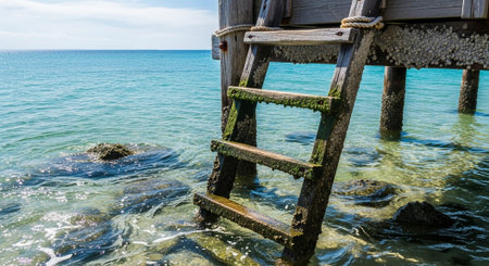 old ladder descending from the wooden pier to the sea