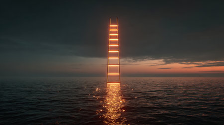 Surreal scene featuring glowing ladder rising from ocean, illuminated by warm sunset. tranquil water reflects light, creating dreamlike atmosphere