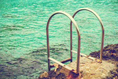 Metal staircase to the clear turquoise water of a sea for swimming. Summer vacation at exotic resort