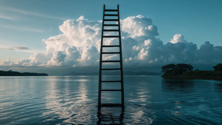 Wooden ladder rising from tranquil water surface towards majestic clouds in serene natural landscape evokes concepts of ambition, achievement, and spiritual ascension. Ai generated image